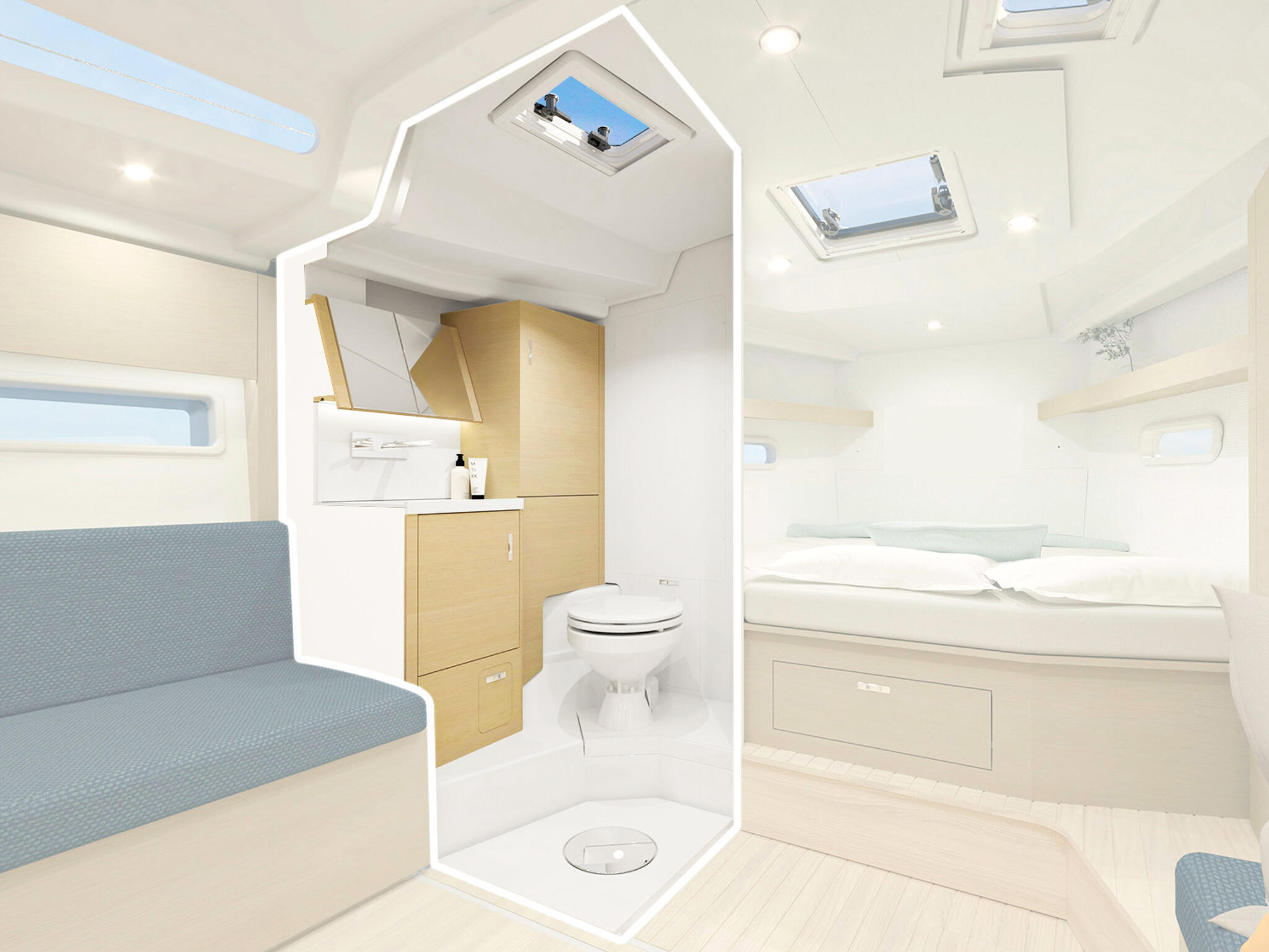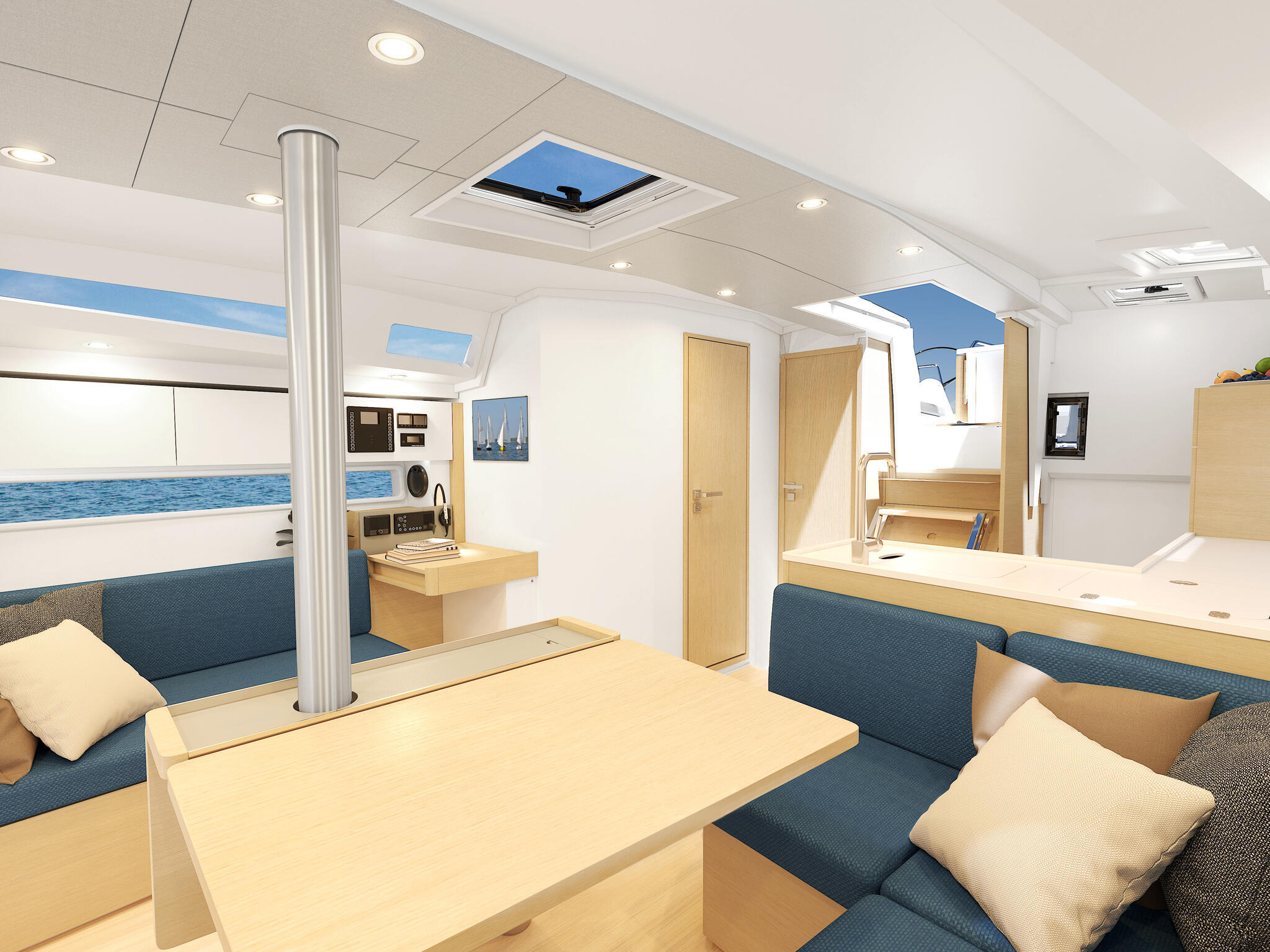 - Világos belső (bútor: Canadian chestnut, padló: Acacia, kárpit: Florence/Glacier, konyhapult: Off White)