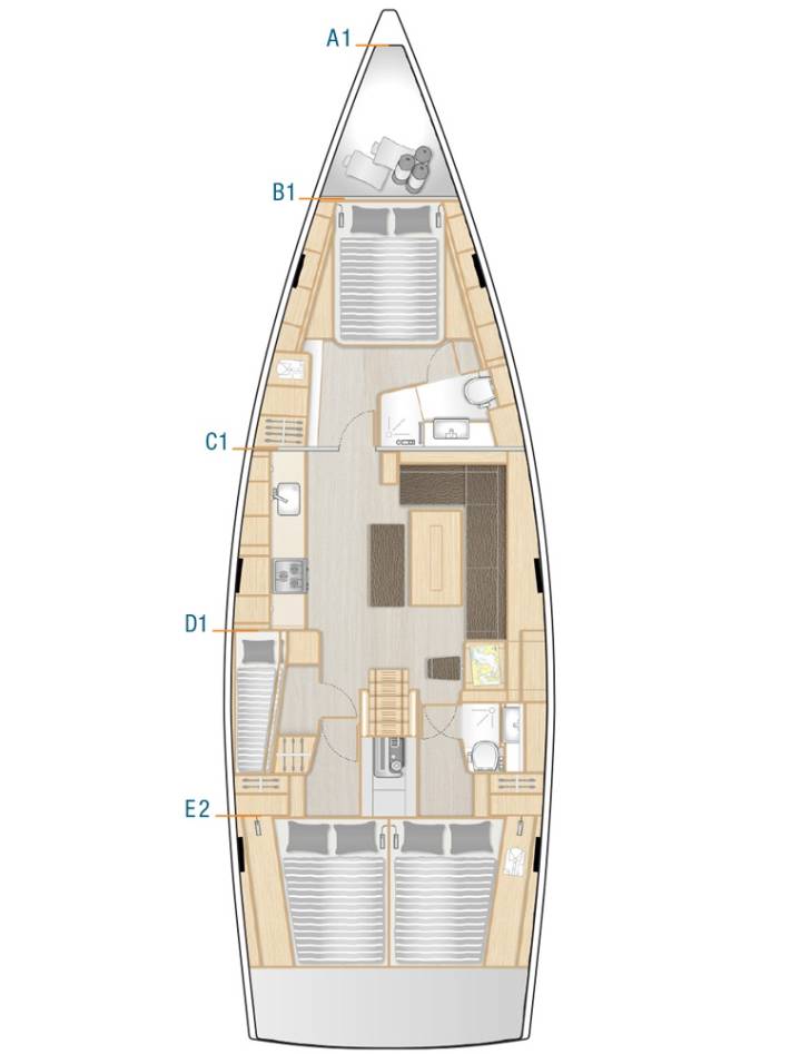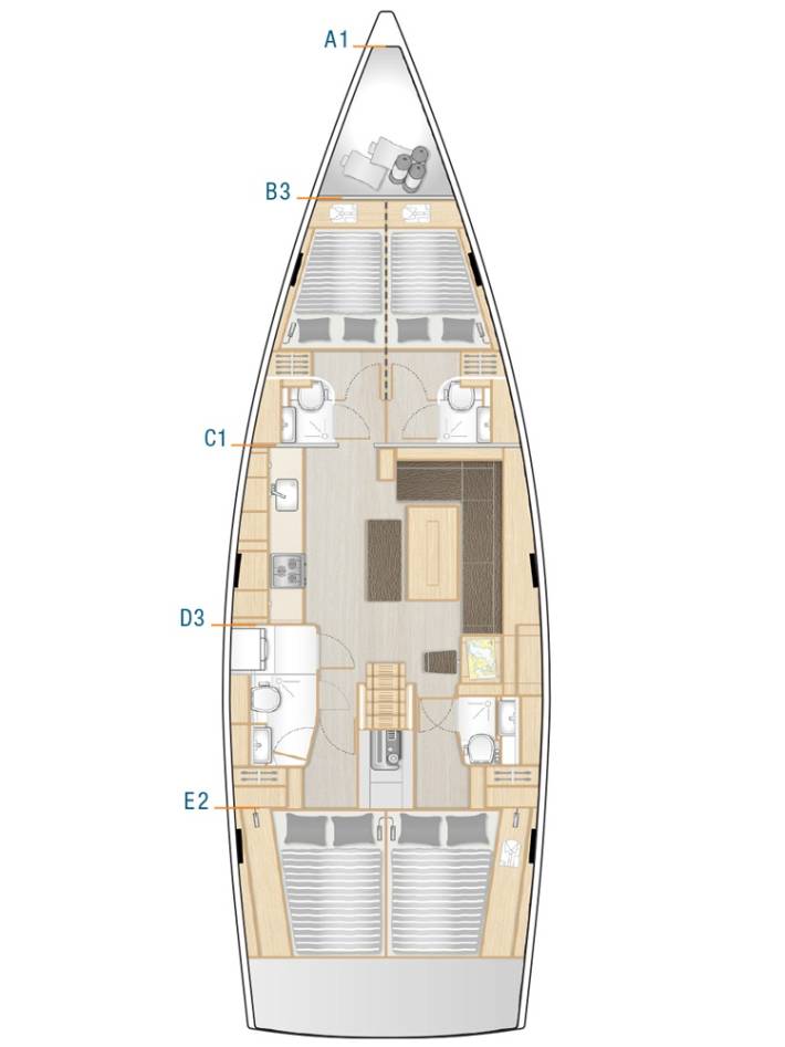- B1 – Nagy méretű, tulajdonosi kivitelű orrkabin – külön mosdóval + WC-vel